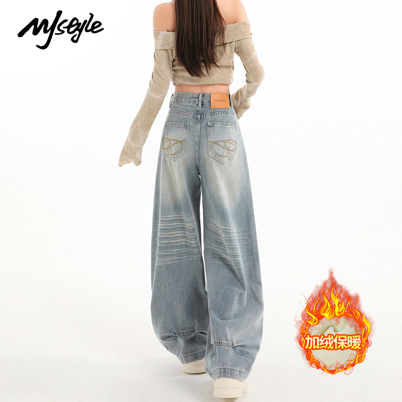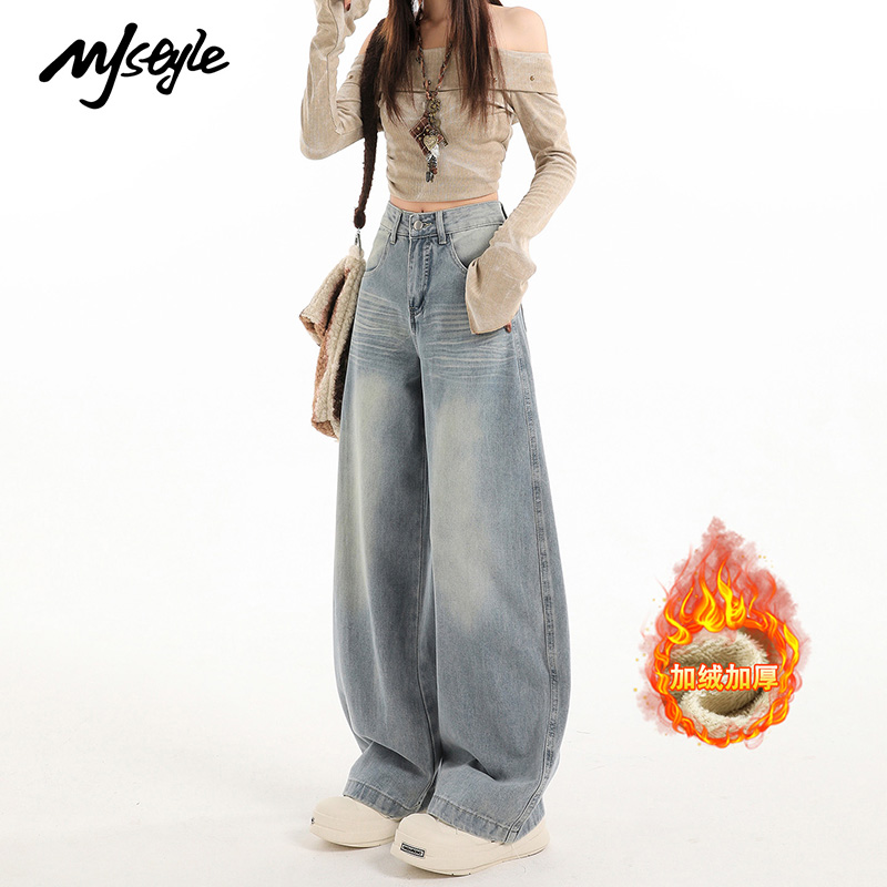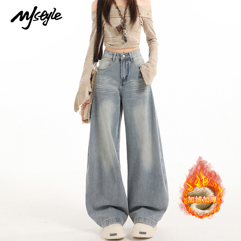 MJ STYLE复古加绒阔腿牛仔裤女2025秋冬新款宽松显瘦垂感拖地裤子 - MJSTYLE服饰旗舰店