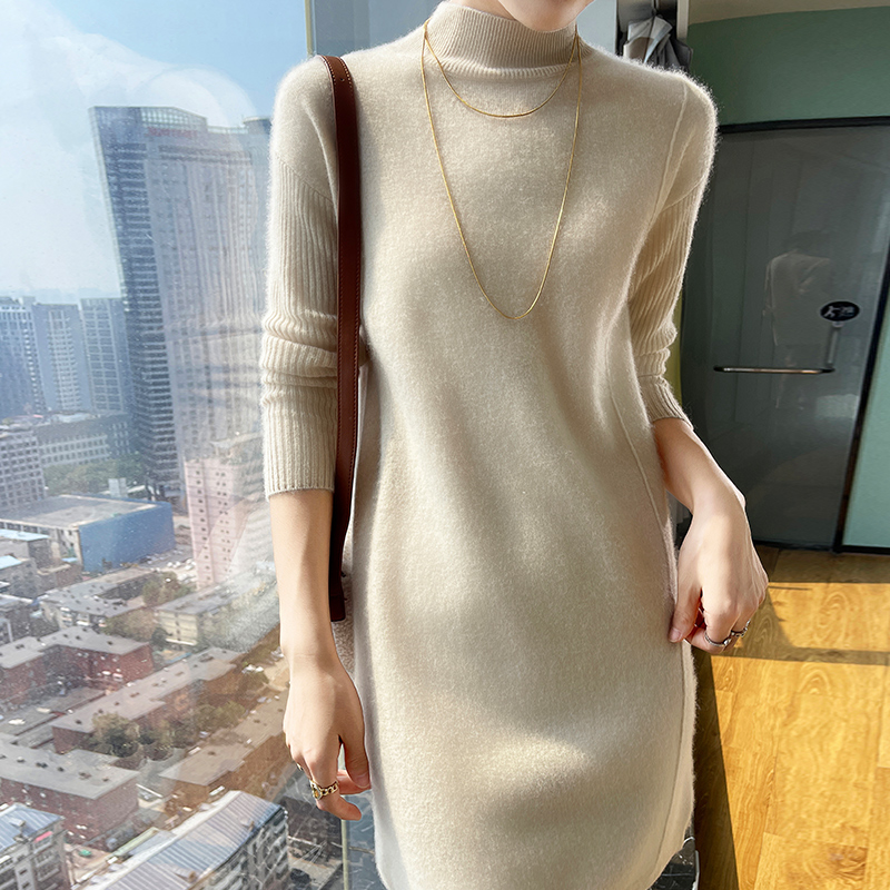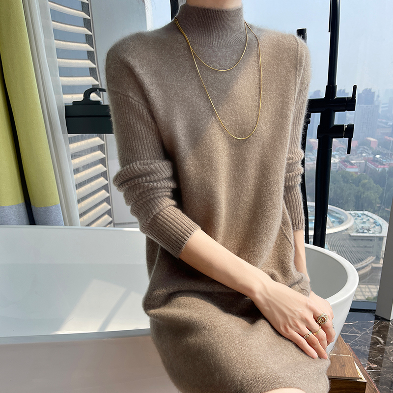 25秋冬款中长款100%纯羊毛衫女半高领长裙毛衣宽松羊绒打底连衣裙 - 梦茜韵高端羊绒衫工厂直销店