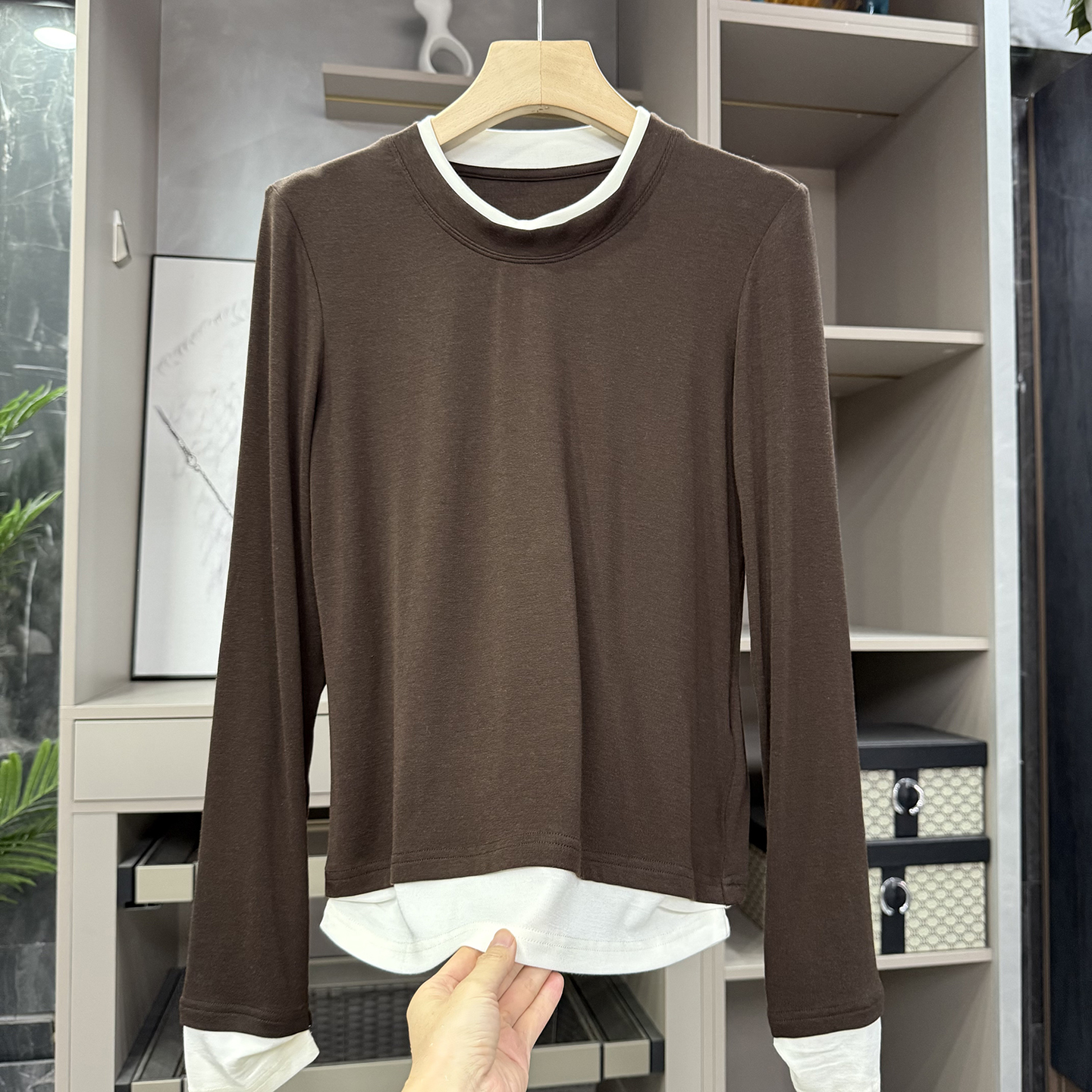 您的位置:他他商城  >   >  怒推!裸感ji别!假两件薄款羊毛圆领长袖针织打底衫女 H96323~ZY