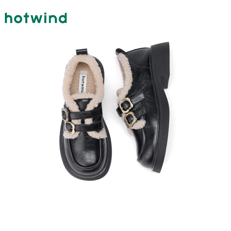 热风加绒乐福鞋女2025年冬季新款黑色小皮鞋英伦风通勤毛毛鞋女鞋 - 热风官方店
