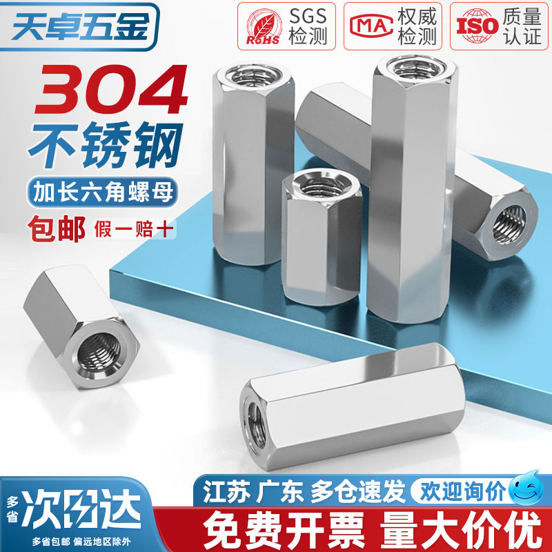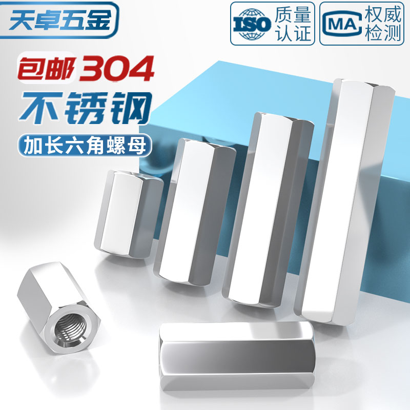304不锈钢六角加长螺母螺丝帽丝杆牙条对接螺杆接头连接母MM3-M24 - 天卓五金官方旗舰店