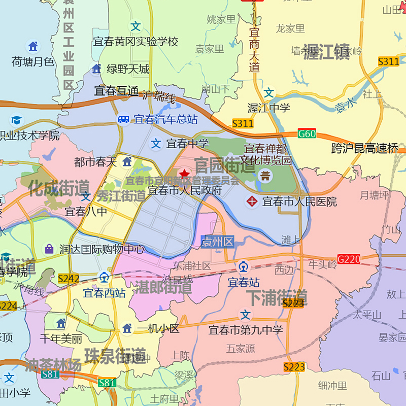 袁州区地图90cm现货墙贴江西省宜春市高清图片区域颜色划分新款