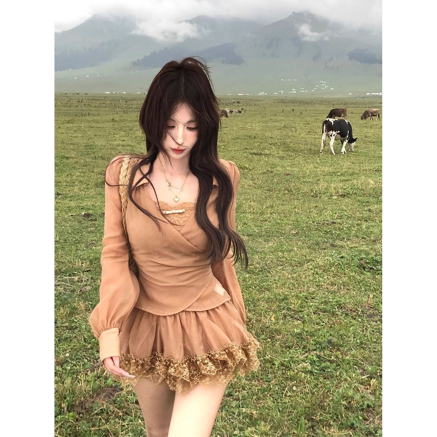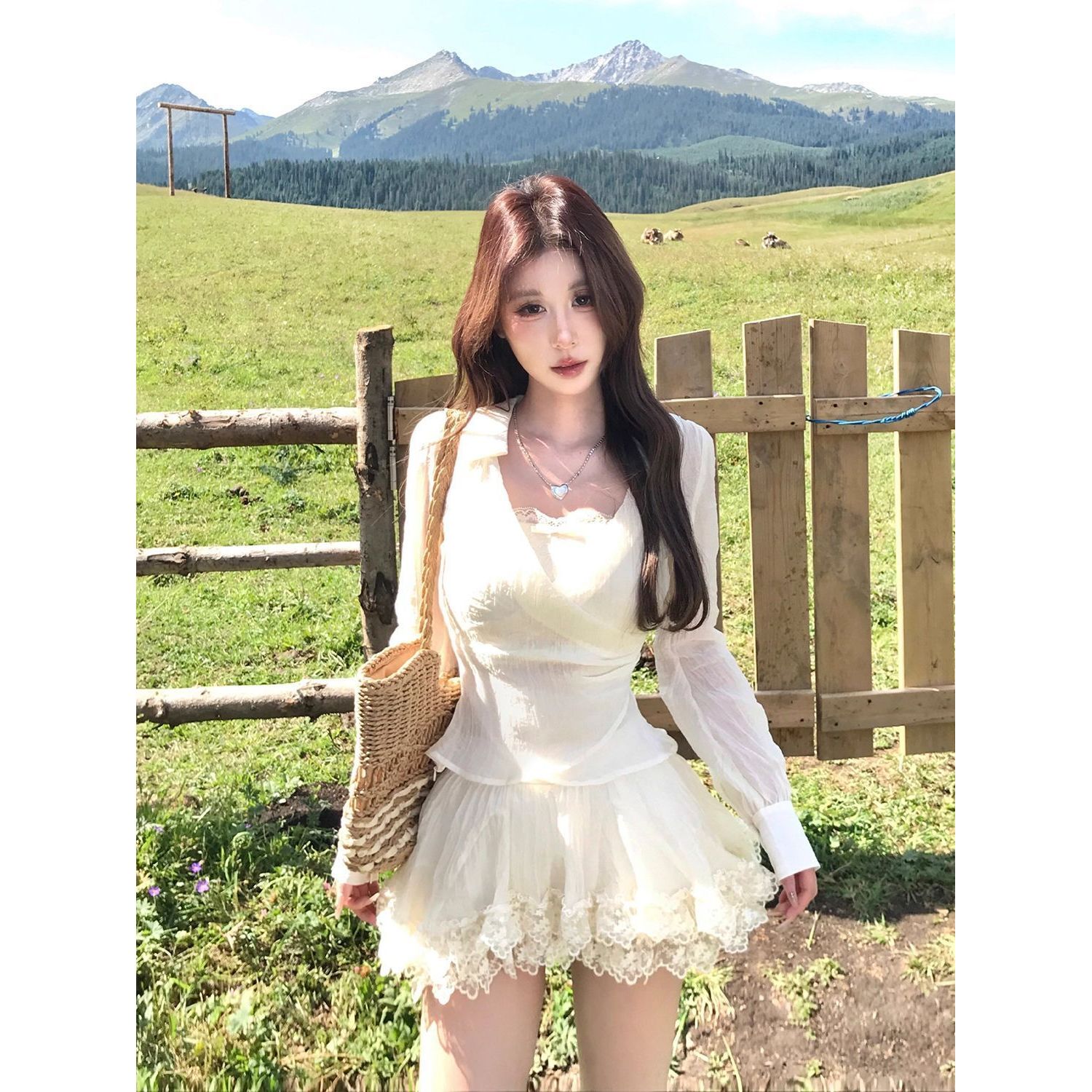 晨昏星沙 早秋法式女收腰蕾丝长袖上衣+蕾丝花边短裙纯欲气质套装 - 仙女穿搭服装