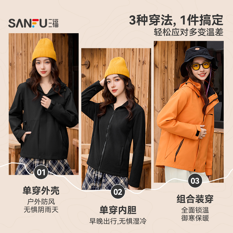 三福加厚外套2025新款冬季连帽摇粒绒内胆户外情侣两件套外套女装