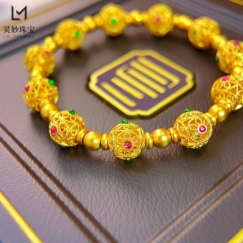 金店同款沙金999古法鎏彩花丝珐琅绣球圆珠手链国潮风送女友礼物 - 灵妙水晶珠宝