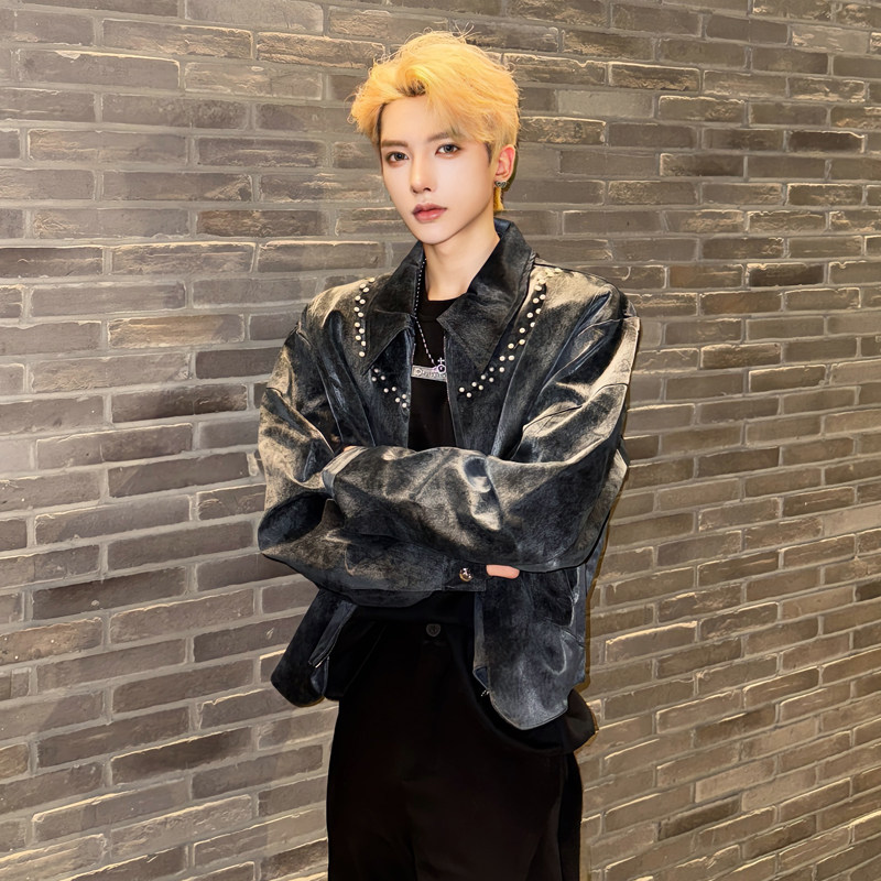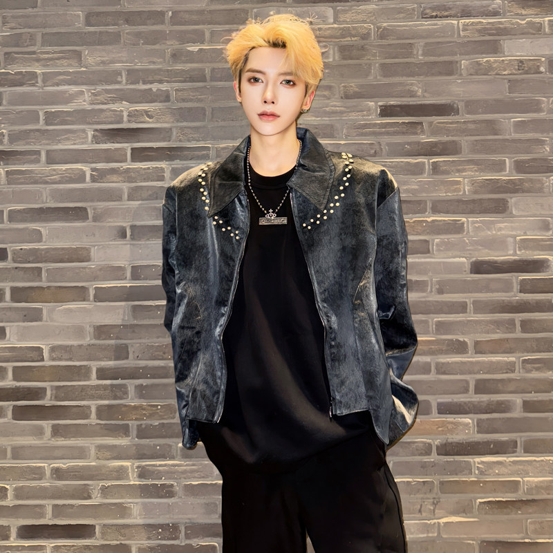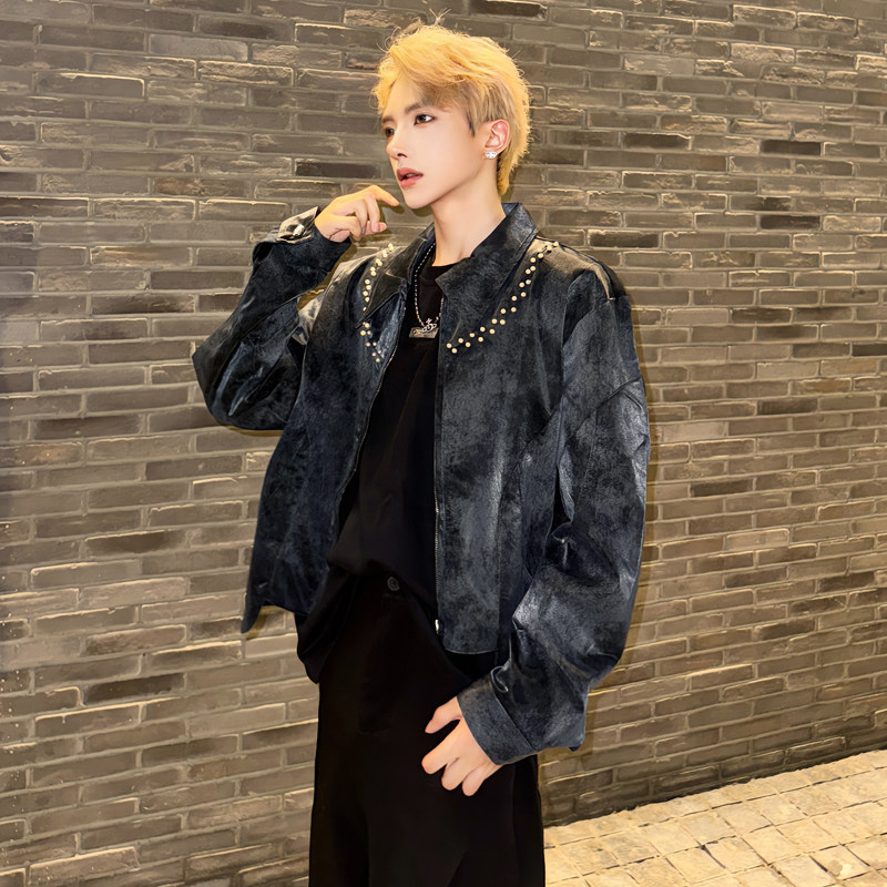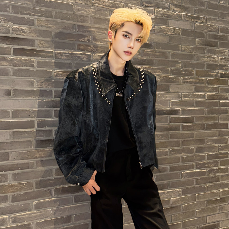 秋季复古高级感痞帅麂皮绒铆钉夹克短款外套潮流男模穿搭得吃上衣 - 我爱文艺美型男