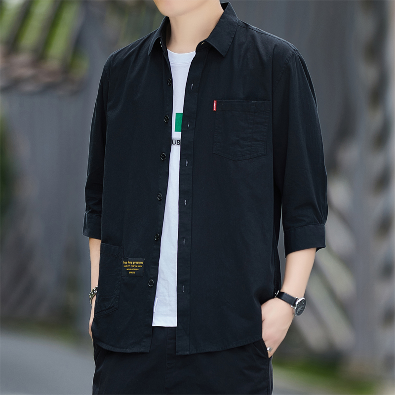 皮尔卡丹高档男士纯棉七分袖长袖百搭衬衫外套中青年韩版工装衬衣