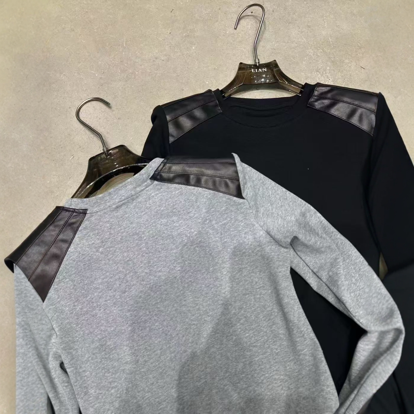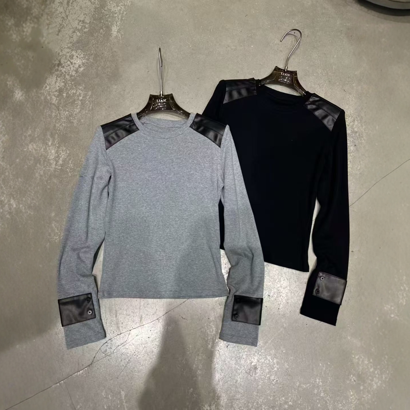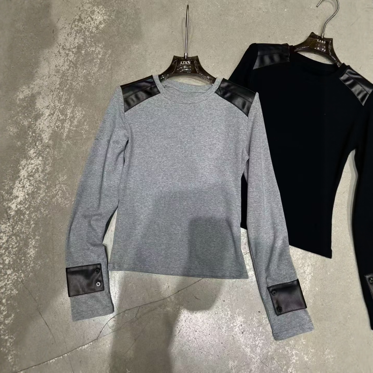 LIAN里安2025秋季新款小众设计撞色拼皮圆领套头打底衫长袖T恤女 - 瓜瓜家 十三行女装批发