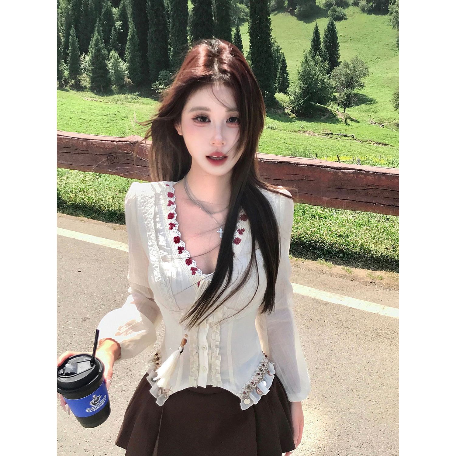 您的位置:他他商城  >   >  赛里木湖 纯欲甜辣修身设计感t恤女长袖花边上衣+半身裙两件套秋
