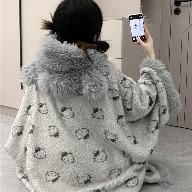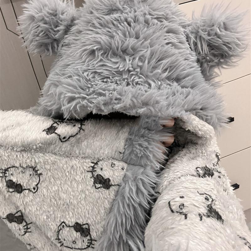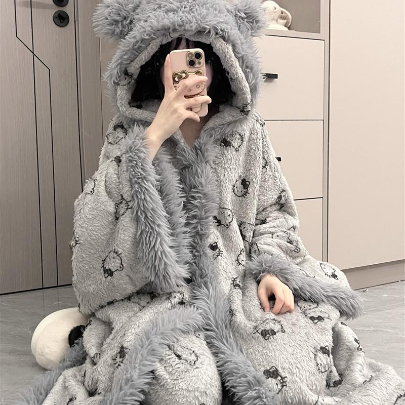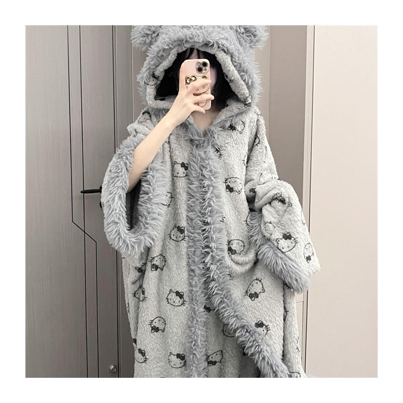 斗篷睡袍可爱灰色冬季毛绒加厚保暖冬天防寒御寒珊瑚绒长款家居服 - 南极家居用品特卖店
