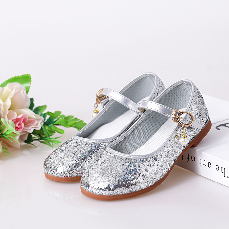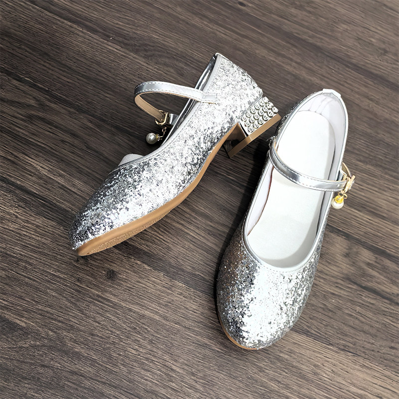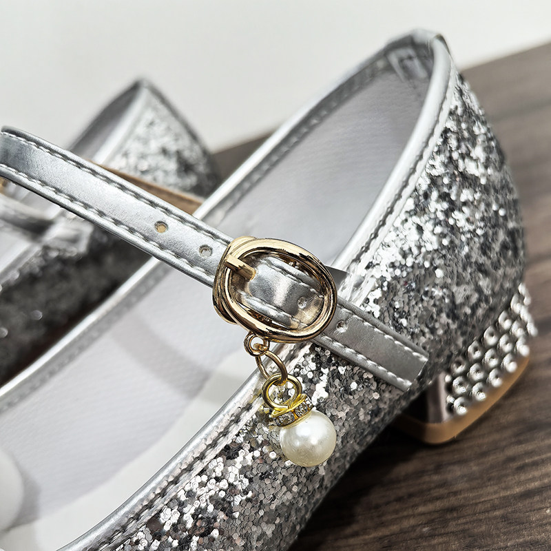 女童高跟鞋水晶亮片鞋软底搭扣礼服鞋学生舞蹈公主鞋银色演出鞋 - 健美鞋业