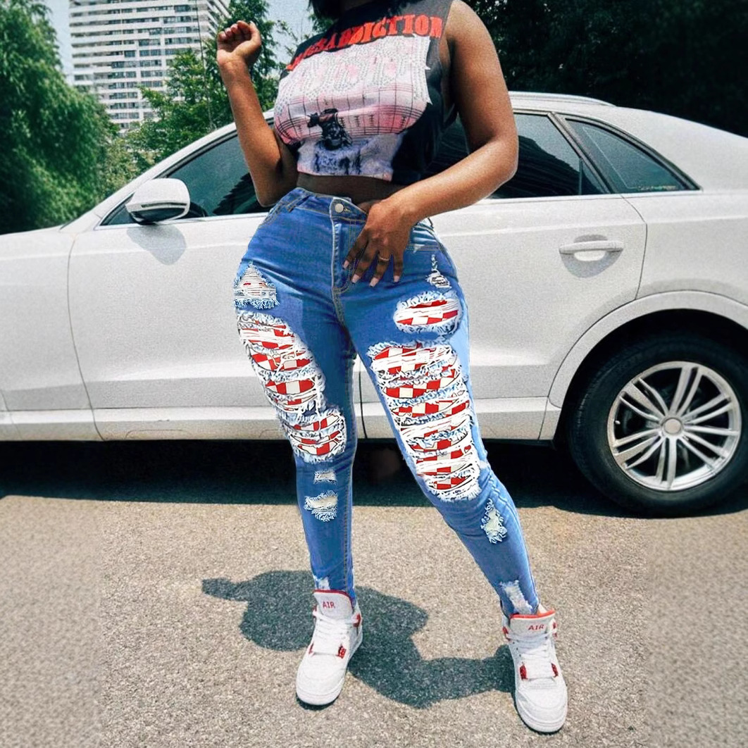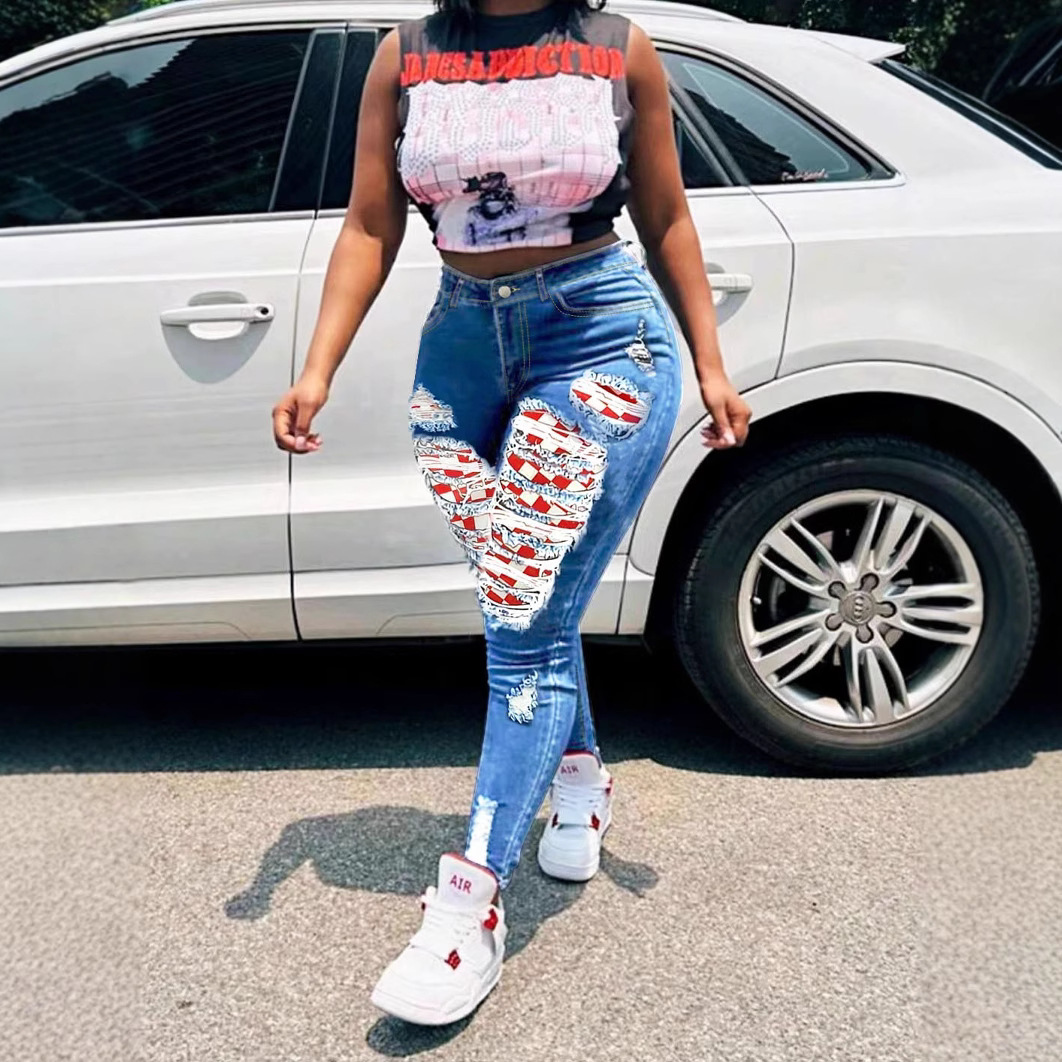Women's sexy peach hip red checkered patch perforated jeans