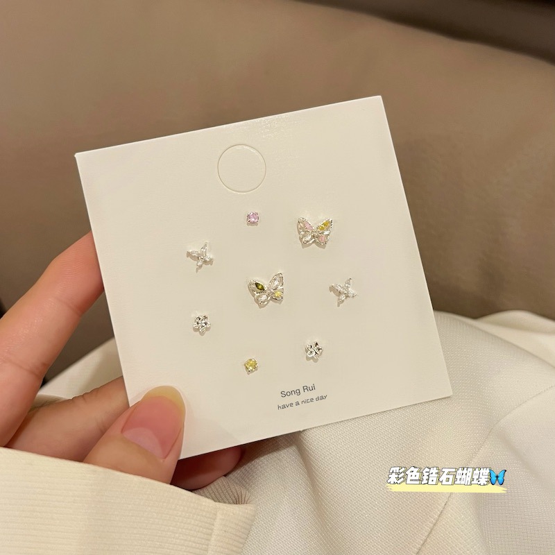 甜美彩色锆石蝴蝶925银耳钉套装甜美时尚精致女小众设计感耳饰 - 幸儿饰品